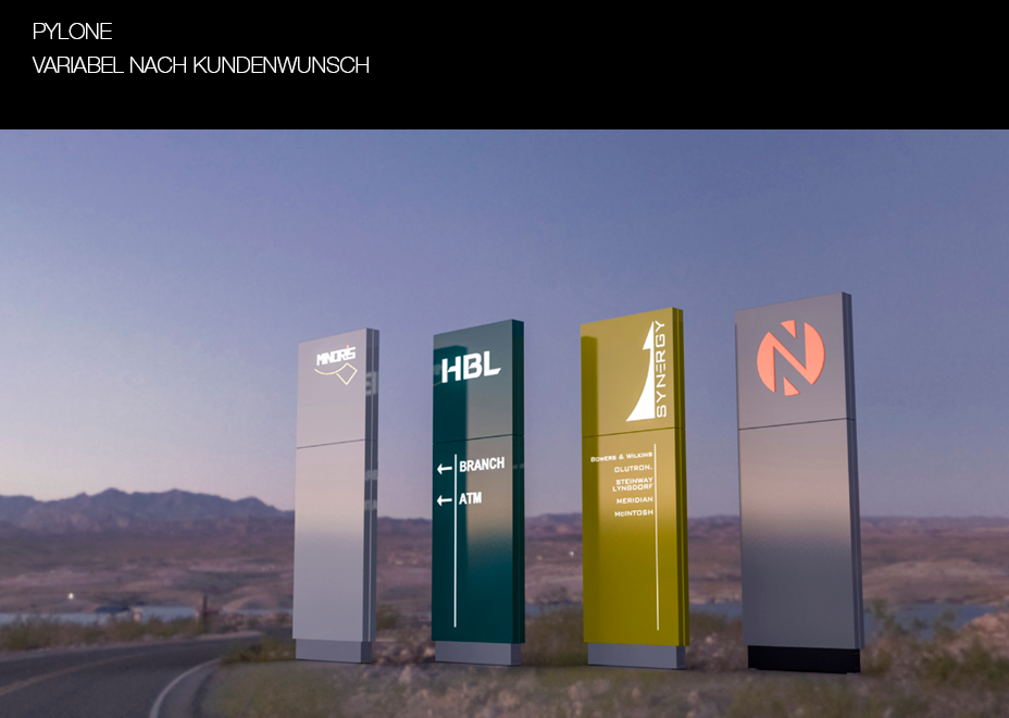 Pylone für Low Budget Projekte, um schnell auf Kundenwünsche zu reagieren und trotzdem, durch Farb- und Beleuchtungsvariation und dem eigenen Firmenlogo, speziell zu sein.